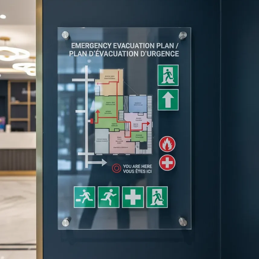 - Haute précision graphique : Impression haute définition des zones, des cheminements d’évacuation et des pictogrammes de sécurité (sorties, points d’eau, premiers secours) pour une orientation instantanée.