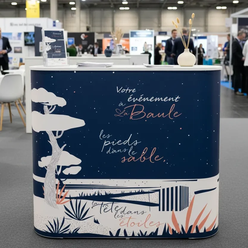 Dans l’univers des salons et des congrès, le premier contact est décisif. Le comptoir Hop-Up, illustré ici par notre superbe réalisation pour la destination La Baule, est la solution privilégiée des exposants qui recherchent un mobilier d’accueil élégant, ultra-rapide à installer et facile à transporter.
