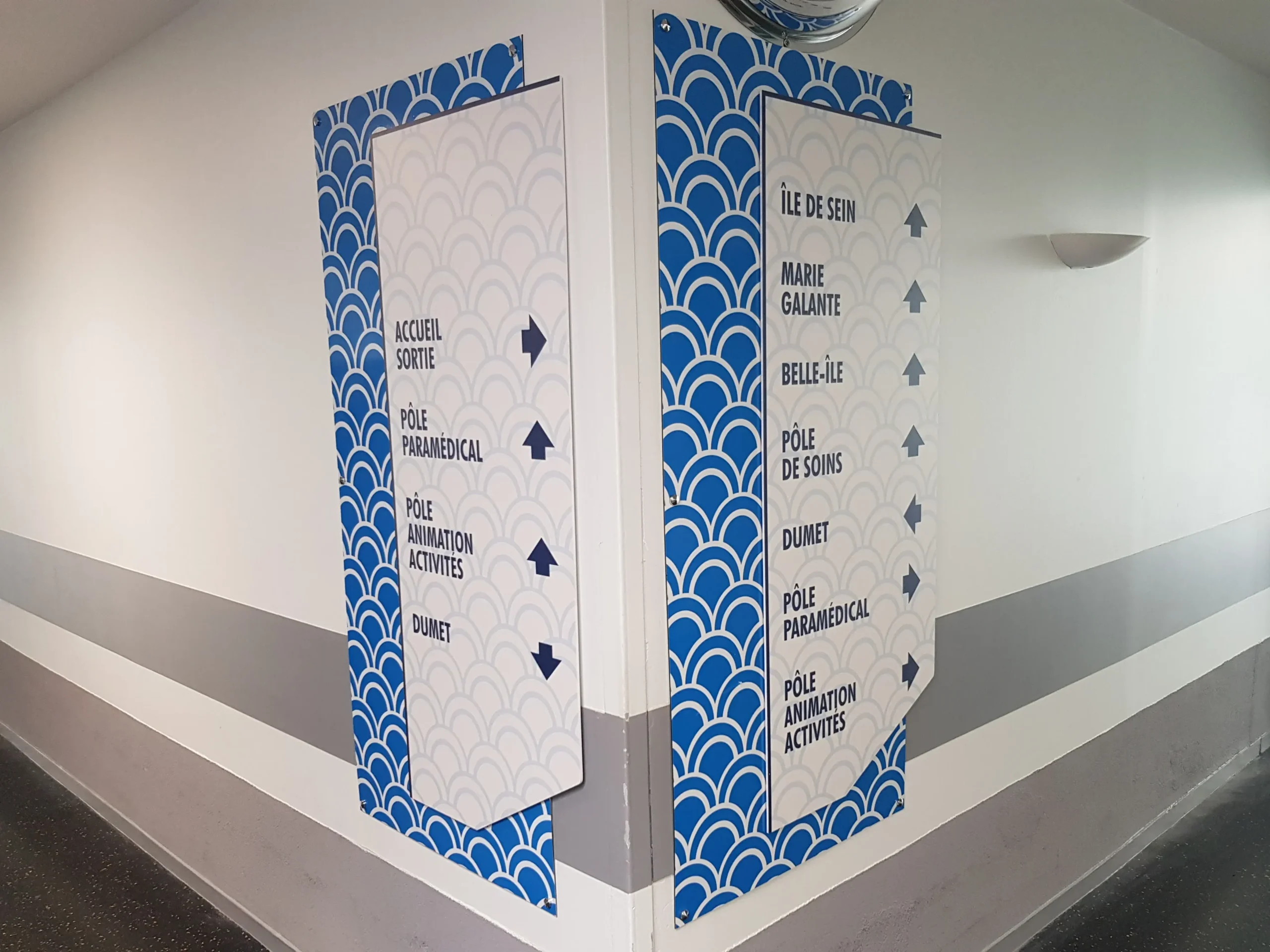• Design graphique intégré : Nous utilisons l’impression directe pour intégrer vos codes couleurs, logos et motifs (comme les vagues bleues pour un pôle maritime) afin de renforcer votre identité visuelle tout en orientant le public.
