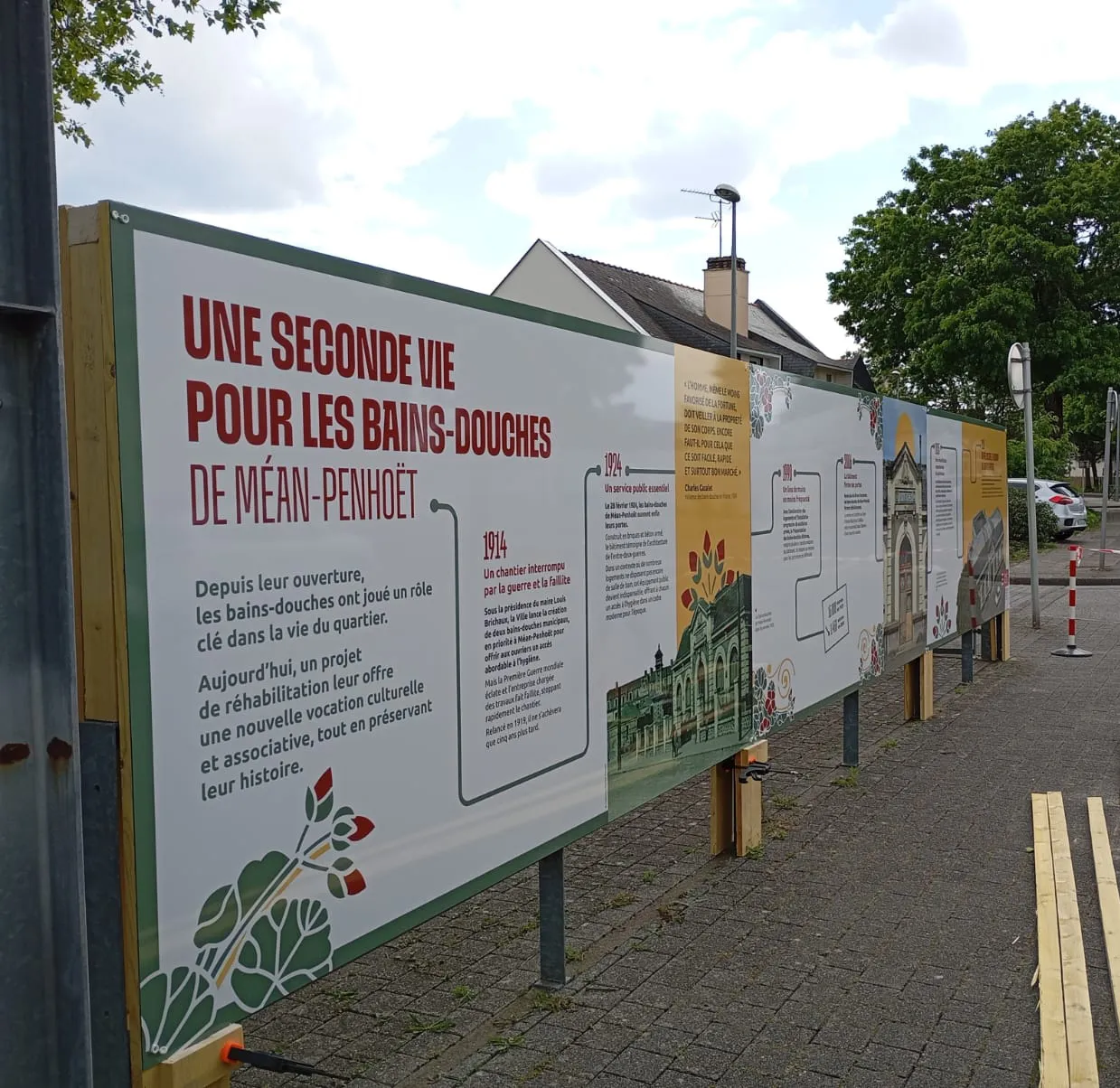 À Saint-Nazaire, le projet de réhabilitation des Bains-Douches de Méan-Penhoët illustre parfaitement comment une signalétique extérieure peut transformer un site en chantier en un véritable support culturel et historique. La Nouvelle Imprimerie a conçu et installé une palissade monumentale qui retrace l’histoire du quartier tout en annonçant la future vocation associative du lieu.